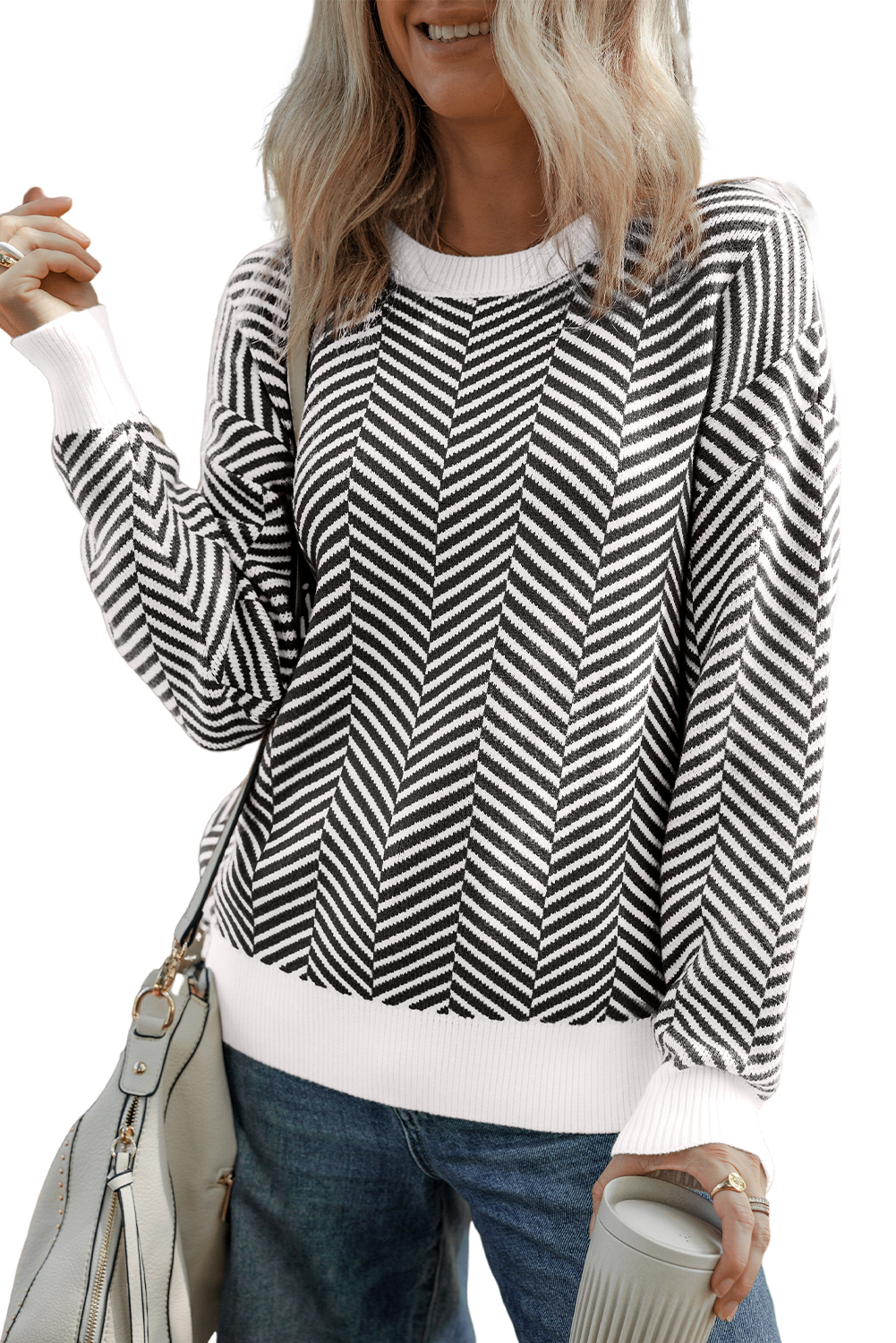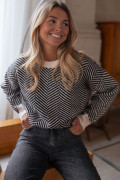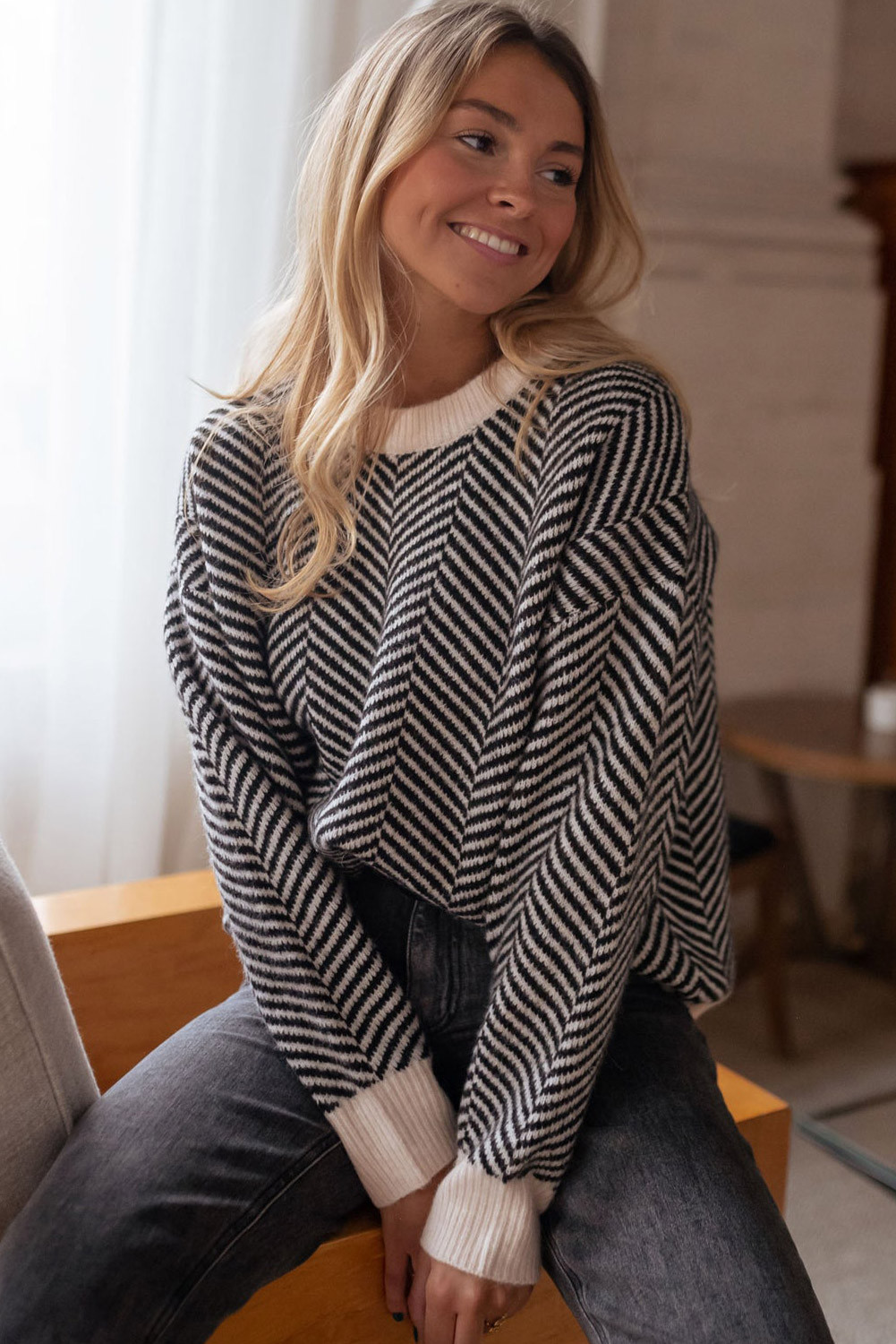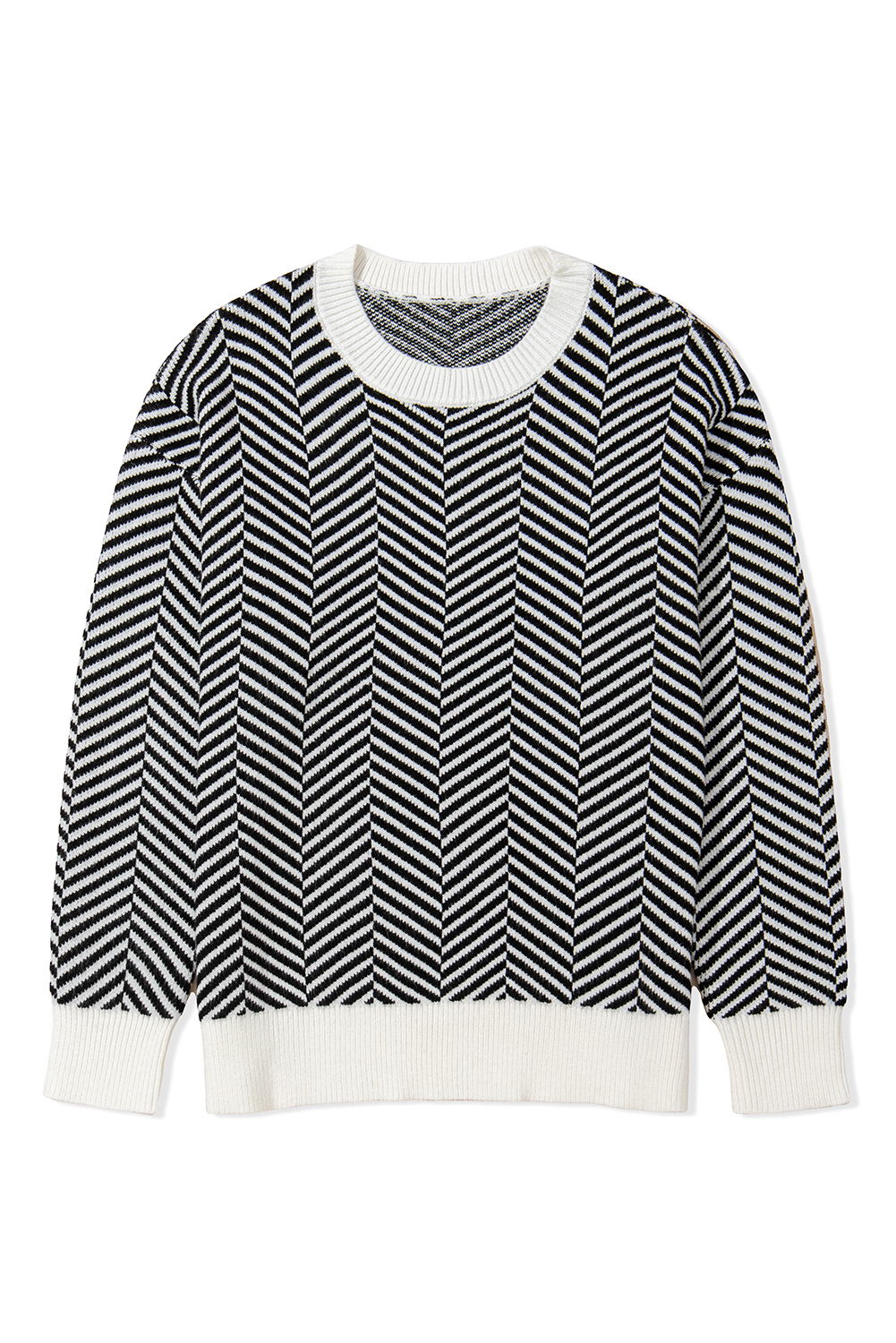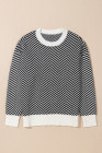 Suéter preto contrastante com gola redonda e ombro caído