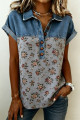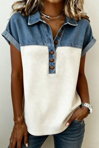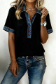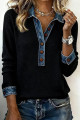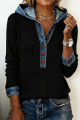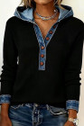 Blusa preta chique com capuz, manga comprida, detalhes em jeans e botões frontais.