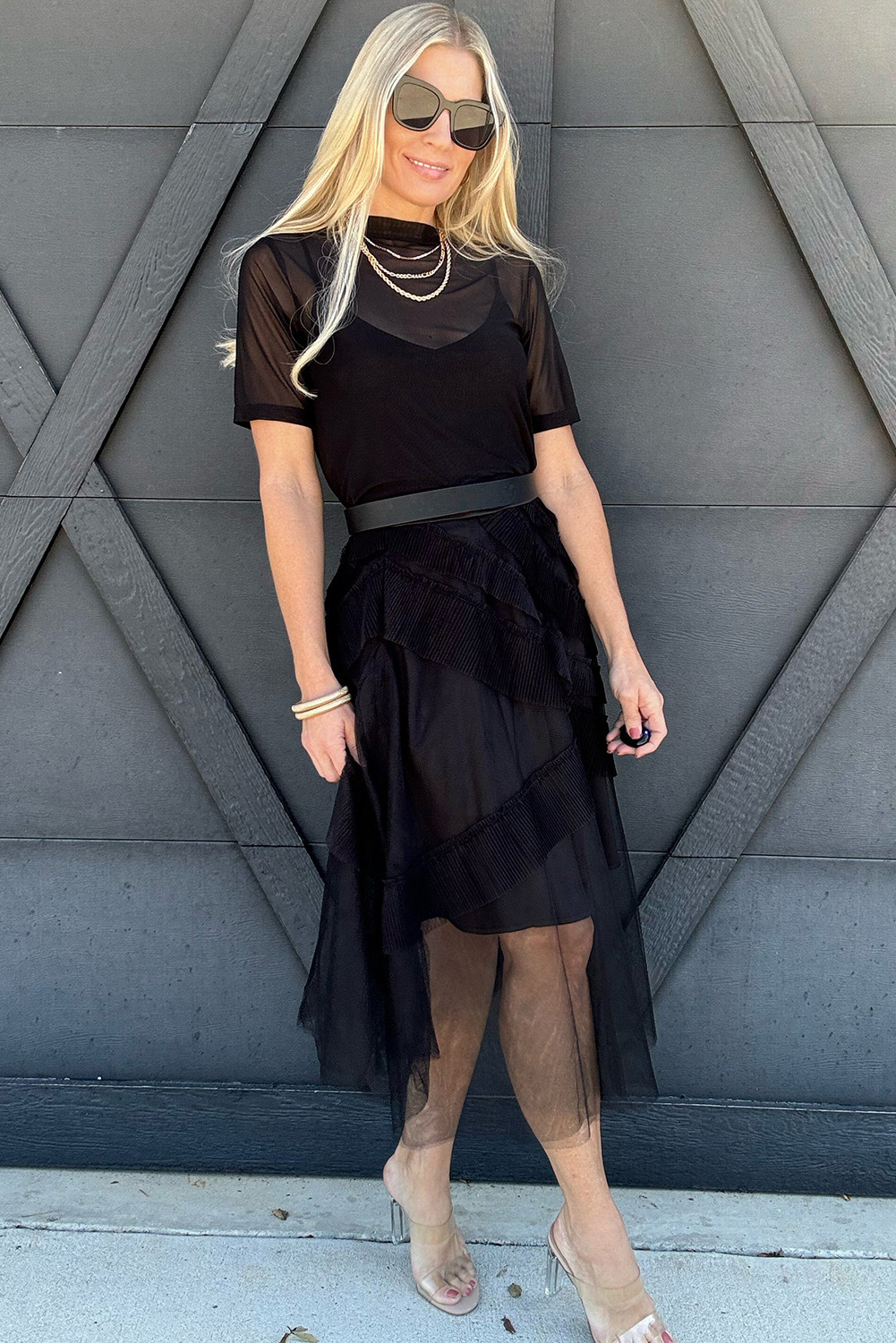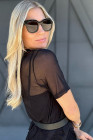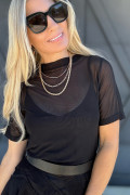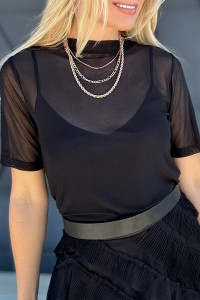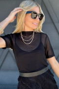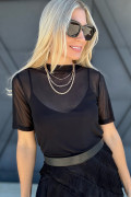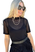 Black Solid Color Sheer Mesh Patchwork Short Sleeve Top