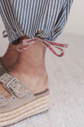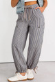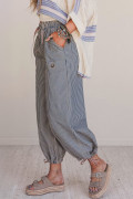 Calça folgada azul listrada com bolso de botão e cordão na cintura elástica.