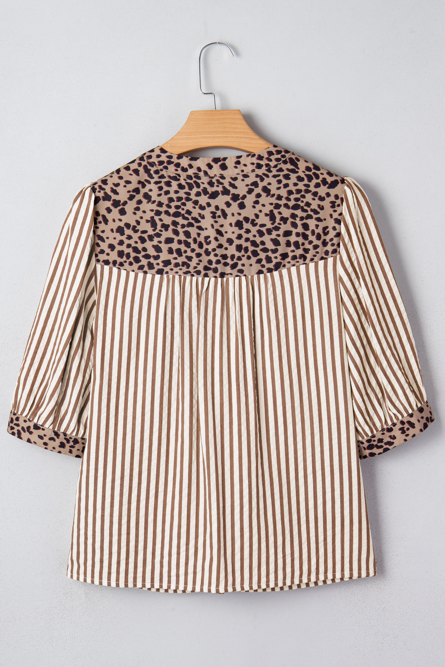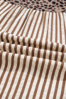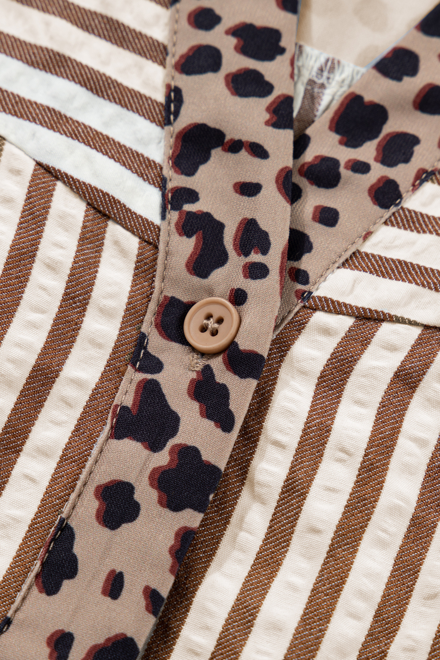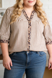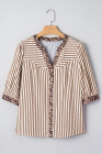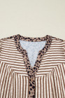 Camisa marrom listrada com acabamento em leopardo e decote em V com botões e manga curta