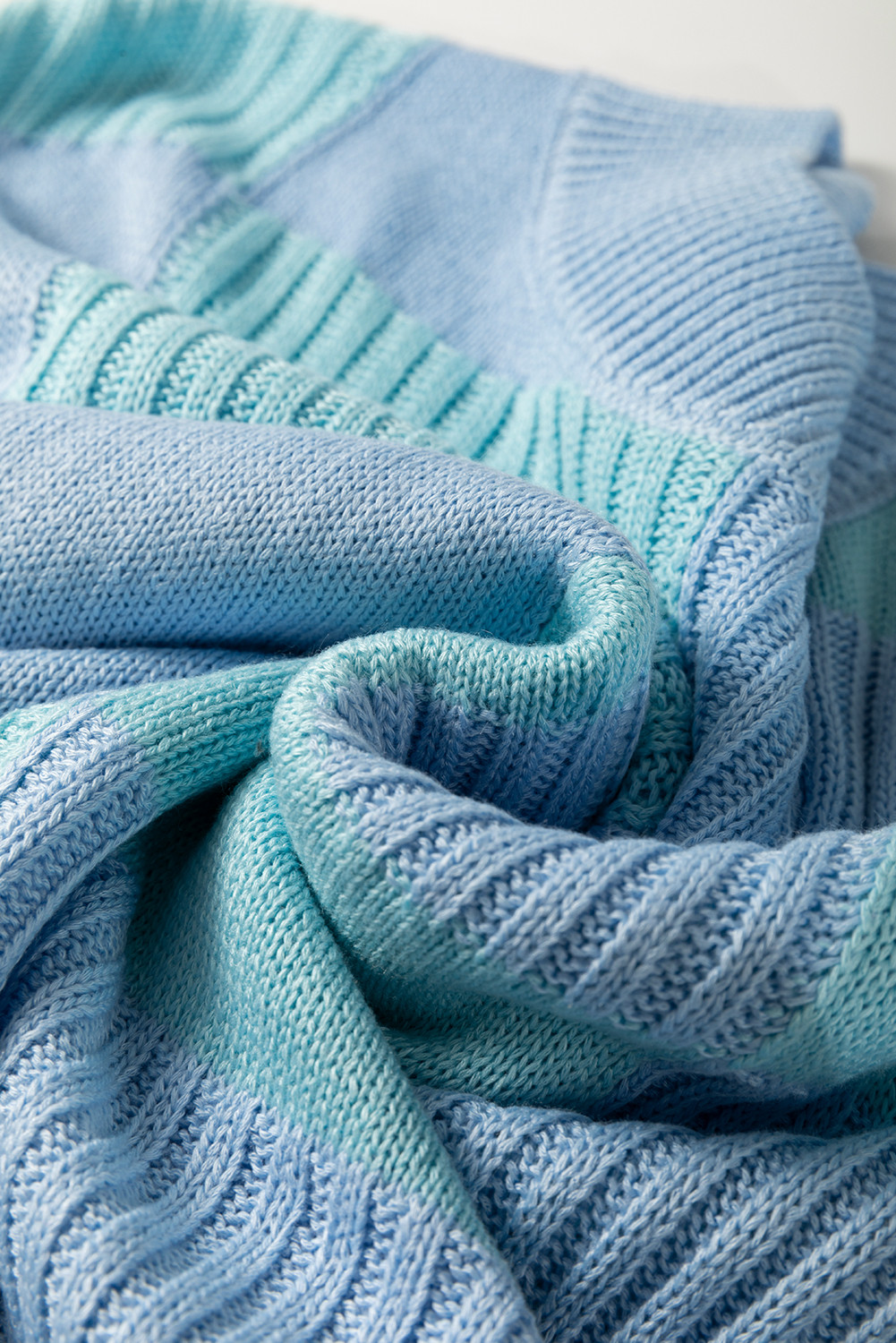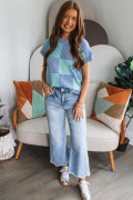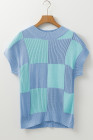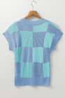 Suéter de manga curta com gola redonda e bloco de cores xadrez azul claro