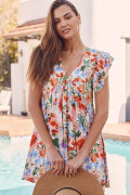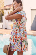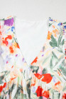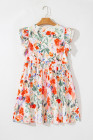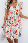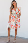 Vestido curto floral rosa com babados duplos e mangas com decote em V e cintura alta