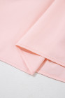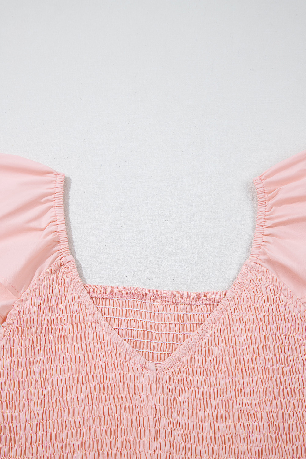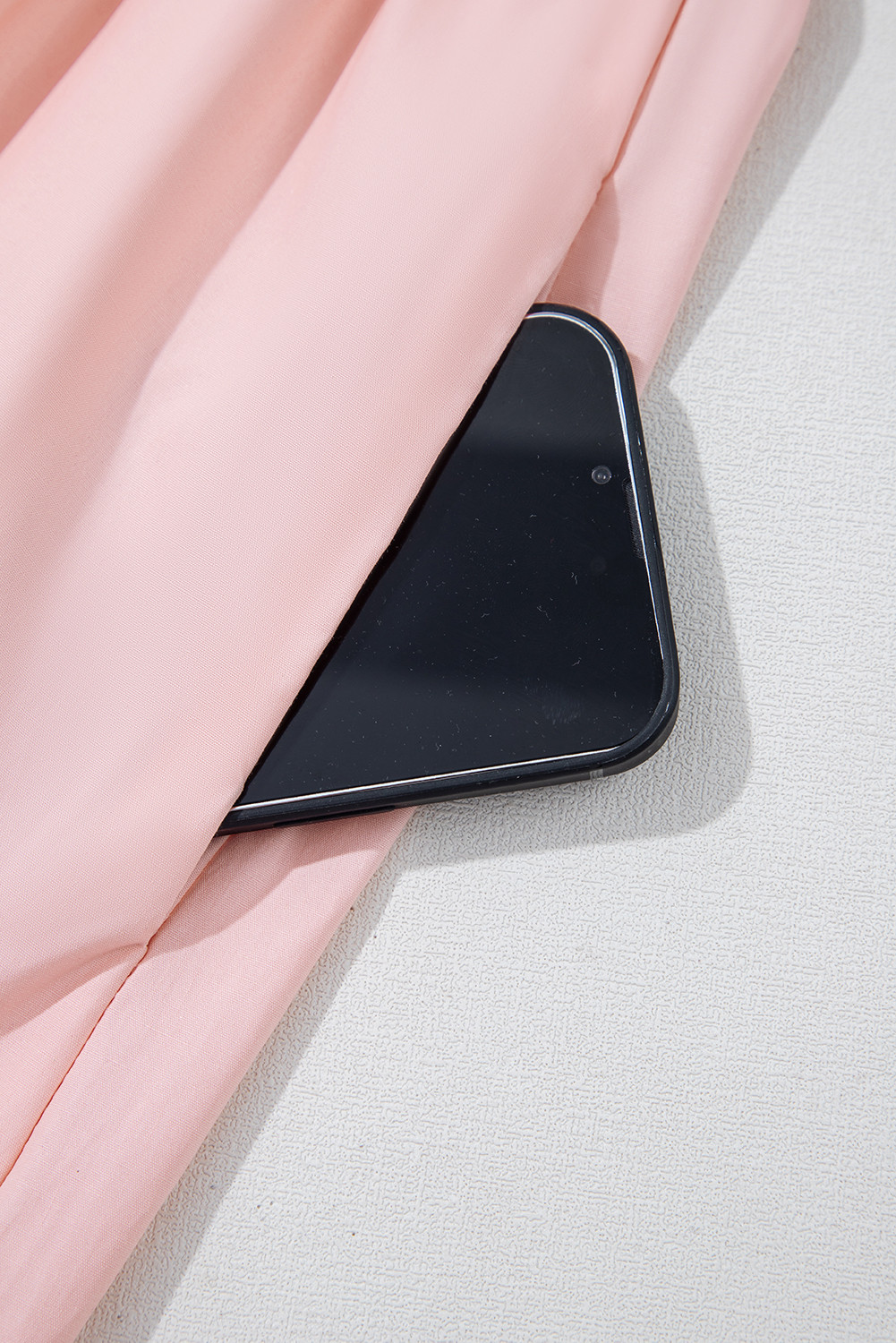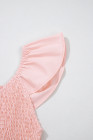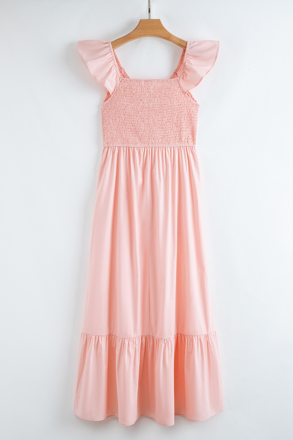 Vestido longo rosa com decote em V, mangas esvoaçantes, corpete franzido, cintura alta e babados