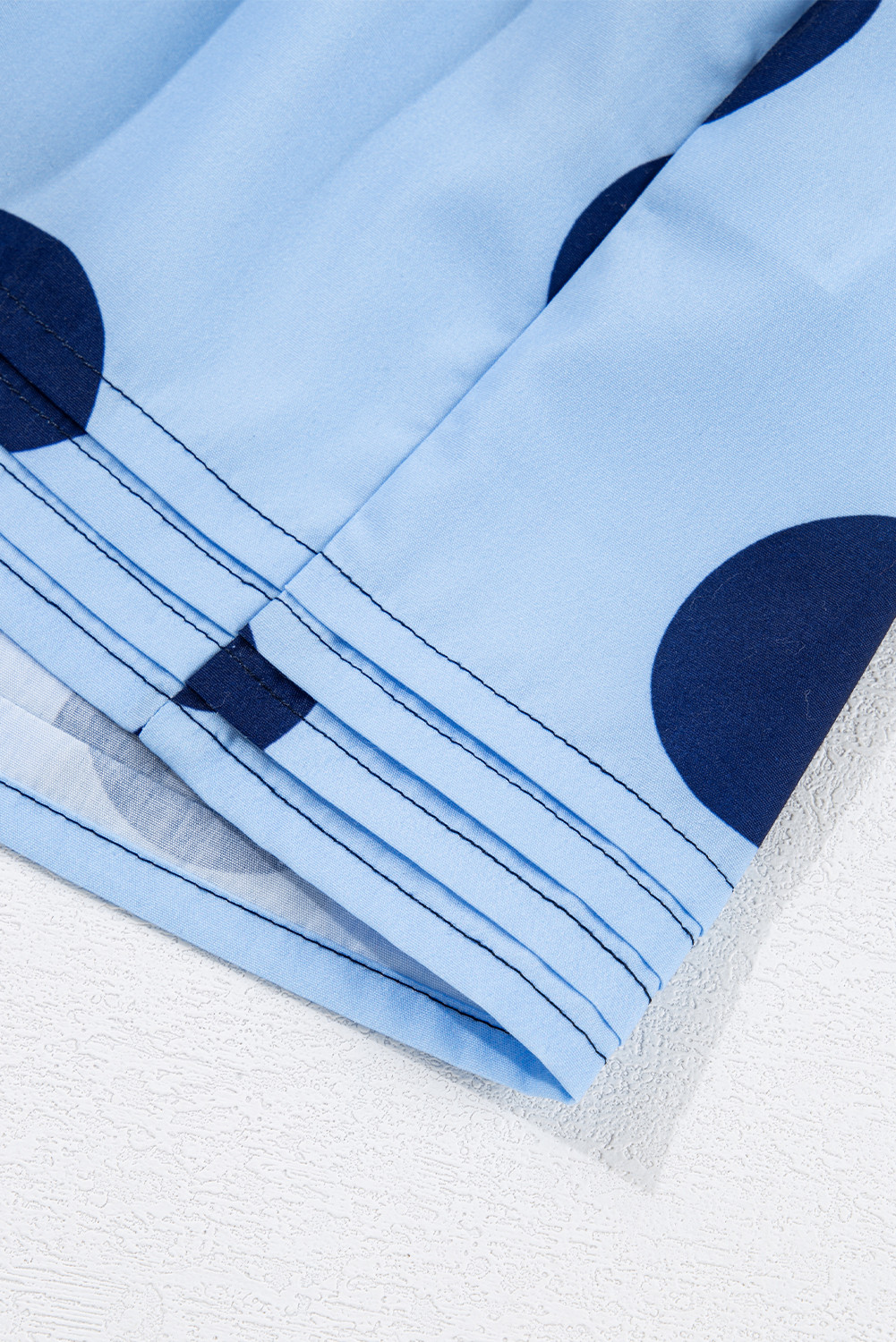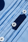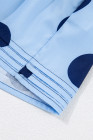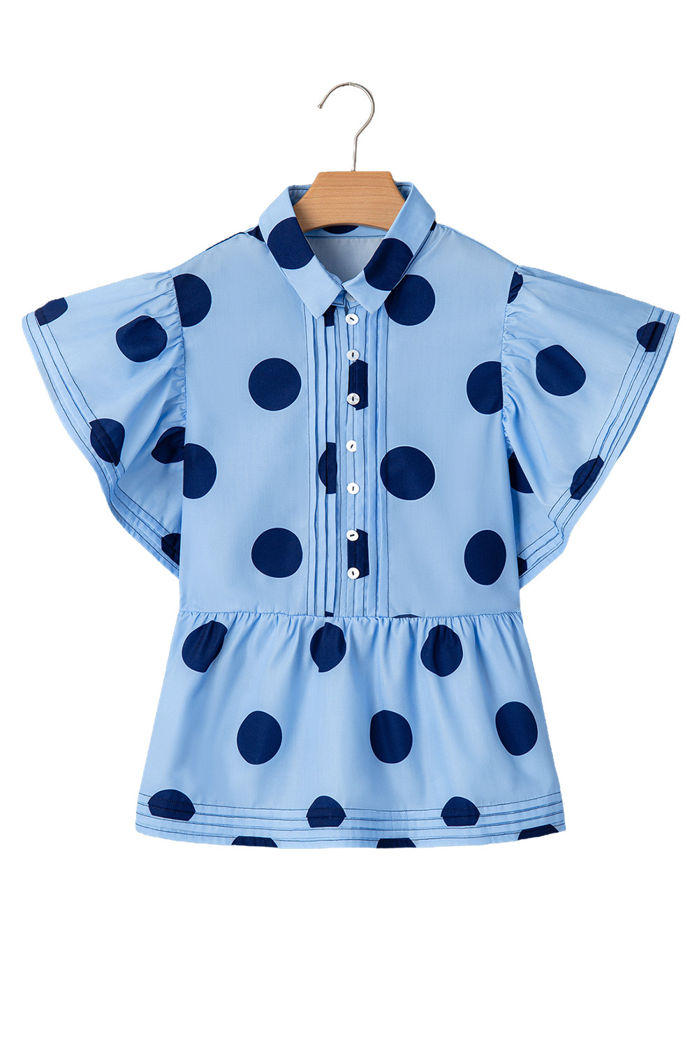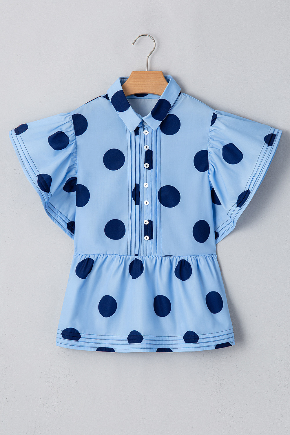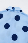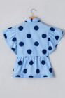Blusa azul-celeste com estampa de bolinhas, manga curta, babados, gola abotoada