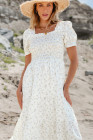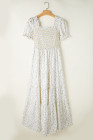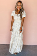 O vestido maxi floral branco com babados franzidos com corpete em camadas é elegante e romântico.