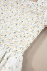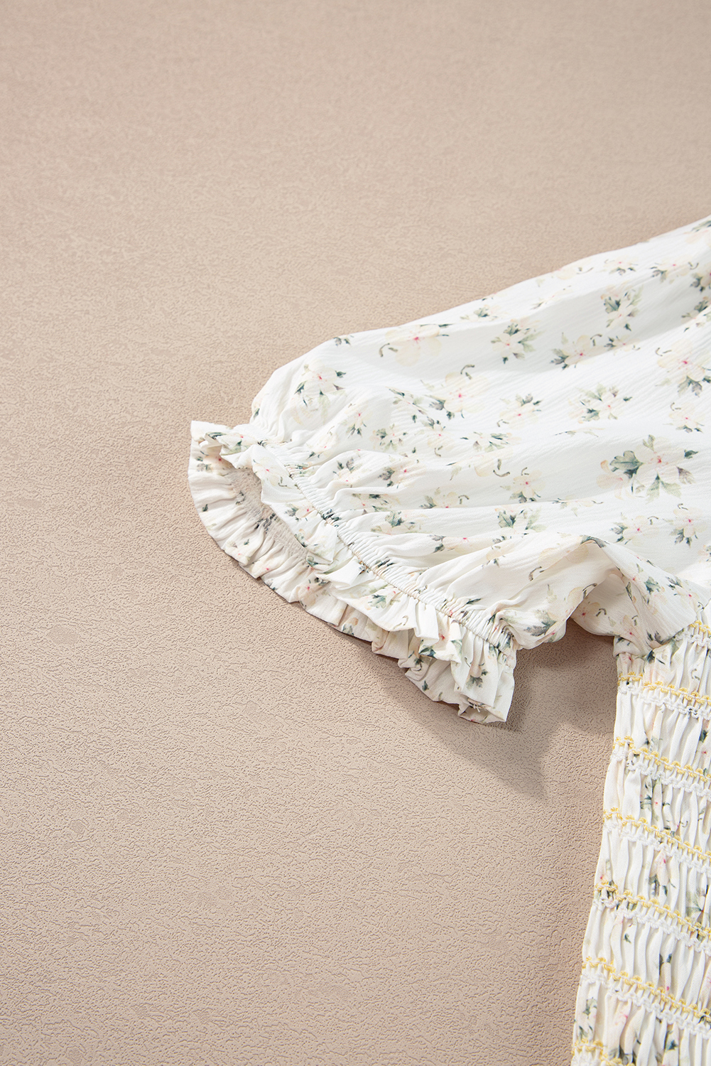 Vestido maxi floral em camadas com corpete franzido e franzido branco