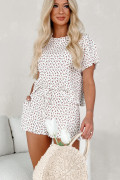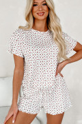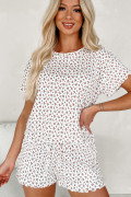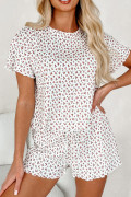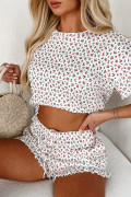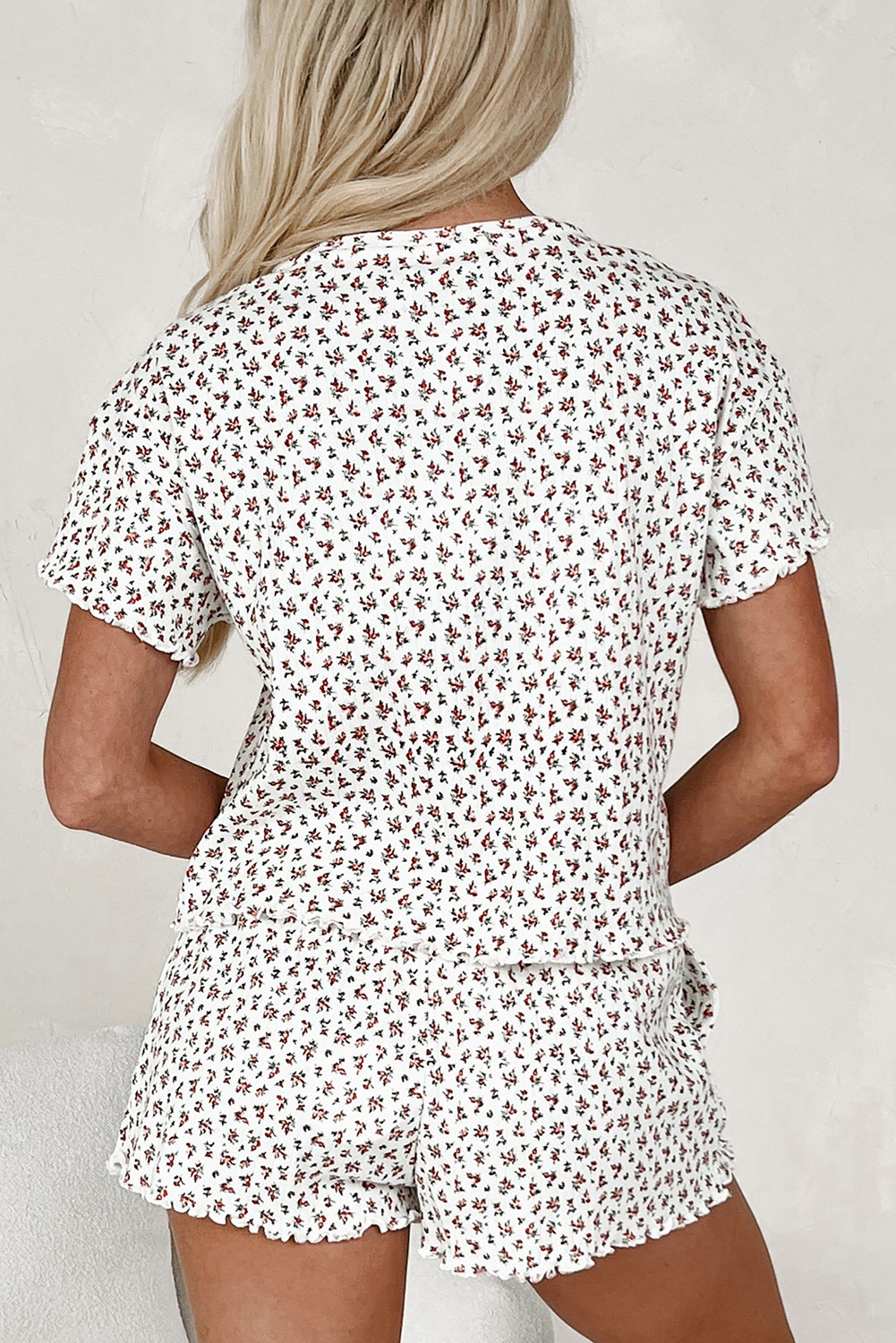 Conjunto de shorts de cintura alta com estampa floral branca e babados, manga curta e nó